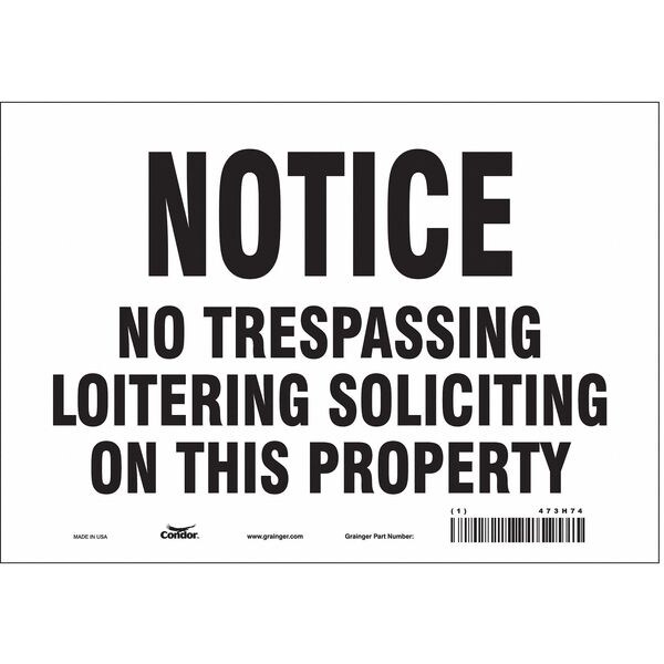 Safety Sign, Vertical Rectangle, Number of Printed Sides 1, English, Sign Format Other Format, Sign Legend No Trespassing Loitering Soliciting On This Property, Sign Legend Background Color White, Sign Legend Style Text