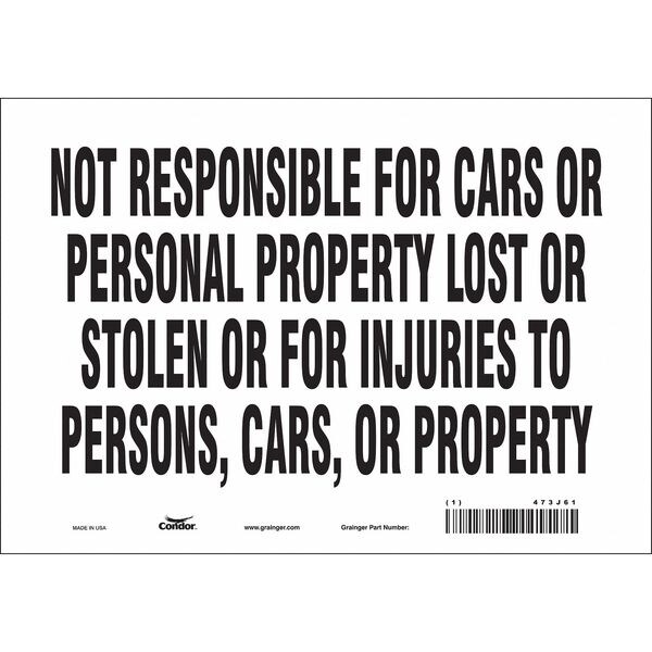 Safety Sign, Vertical Rectangle, Number of Printed Sides 1, English, Sign Format Other Format, Sign Legend Not Responsible For Cars Or Personal Property Lost Or Stolen Or For Injuries To Persons, Cars Or Property, Sign Legend Background Color White, Sign Legend Style Text