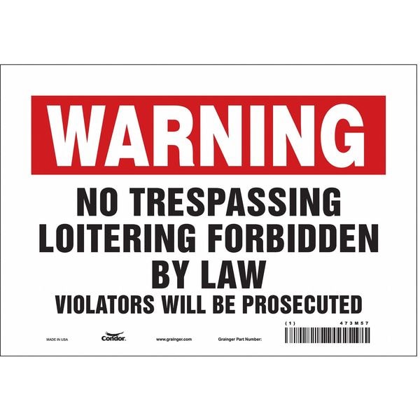 Safety Sign, Vertical Rectangle, Number of Printed Sides 1, English, Sign Format Other Format, Sign Legend No Trespassing Loitering Forbidden By Law Violators Will Be Prosecuted, Sign Legend Background Color Red, White, Sign Legend Style Text