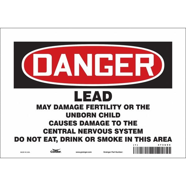 Safety Sign, Vertical Rectangle, Number of Printed Sides 1, English, Sign Format Traditional OSHA, Sign Legend Lead May Damage Fertility Or The Unborn Child Causes Damage To The Central Nervous System Do Not Eat, Drink Or Smoke In This Area, Sign Legend Background Color White, Sign Legend Style Text