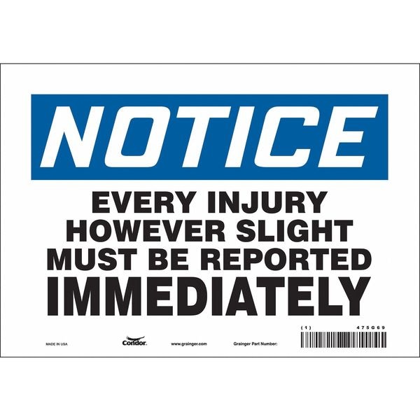 Safety Sign, Vertical Rectangle, Number of Printed Sides 1, English, Sign Format Traditional OSHA, Sign Legend Every Injury However Slight Must Be Reported Immediately, Sign Legend Background Color White, Sign Legend Style Text