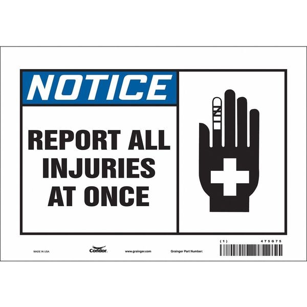 Safety Sign, Vertical Rectangle, Number of Printed Sides 1, English, Sign Format Traditional OSHA, Sign Legend Report All Injuries At Once, Sign Legend Background Color White, Sign Legend Style Symbol and Text