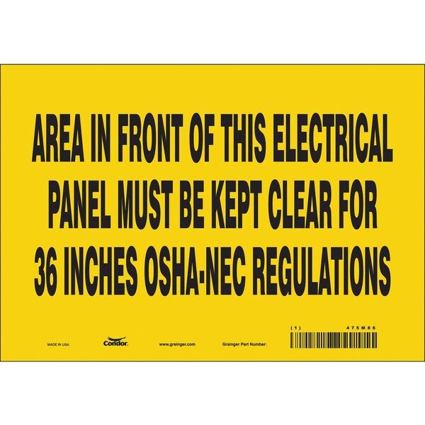 Safety Sign, Vertical Rectangle, Number of Printed Sides 1, English, Sign Format Other Format, Sign Legend Area In Front Of This Electrical Panel Must Be Kept Clear For 36 In Osha-Nec Regulations, Sign Legend Background Color Yellow, Sign Legend Style Text