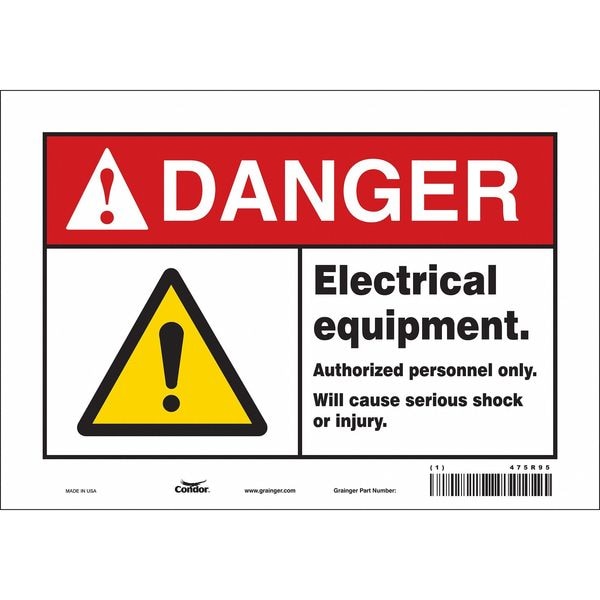 Safety Sign, Vertical Rectangle, Number of Printed Sides 1, English, Sign Format ANSI/OSHA Format, Sign Legend Electrical Equipment. Authorized Personel Only. Will Cause Serious Shock Or Injury., Sign Legend Background Color White, Sign Legend Style Symbol and Text