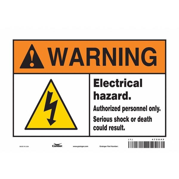 Safety Sign, Vertical Rectangle, Number of Printed Sides 1, English, Sign Format ANSI/OSHA Format, Sign Legend Electrical Hazard. Authorized Personnel Only. Serious Shock Or Death Could Result., Sign Legend Background Color White, Sign Legend Style Symbol and Text