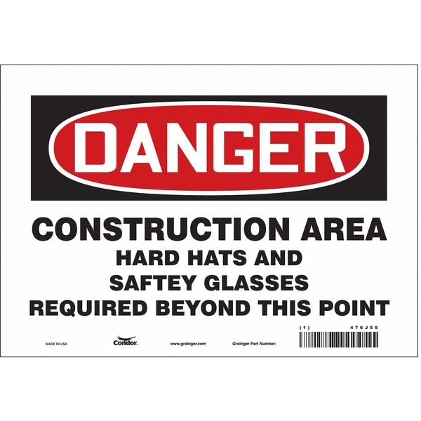 Safety Sign, Vertical Rectangle, Number of Printed Sides 1, English, Sign Format Traditional OSHA, Sign Legend Construction Area Hard Hats And Safety Glasses Required Beyond This Point, Sign Legend Background Color White, Sign Legend Style Text