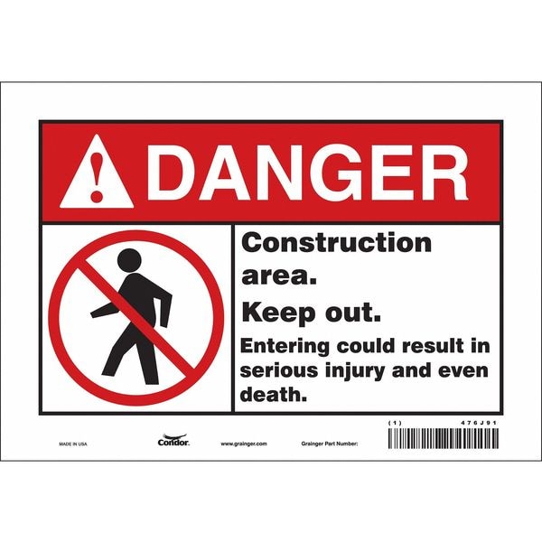 Safety Sign, Vertical Rectangle, Number of Printed Sides 1, English, Sign Format ANSI/OSHA Format, Sign Legend Construction Area. Keep Out. Entering Could Result In Serious Injury And Even Death., Sign Legend Background Color White, Sign Legend Style Symbol and Text