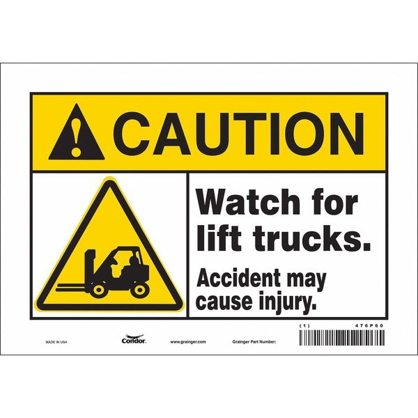 Safety Sign, Vertical Rectangle, Number of Printed Sides 1, English, Sign Format ANSI/OSHA Format, Sign Legend Watch For Lift Trucks. Accident May Cause Injury., Sign Legend Background Color White, Sign Legend Style Symbol and Text