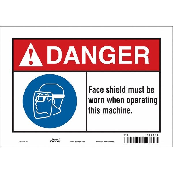 Safety Sign, Vertical Rectangle, Number of Printed Sides 1, English, Sign Format ANSI/OSHA Format, Sign Legend Face Shield Must Be Worn When Operating This Machine., Sign Legend Background Color White, Sign Legend Style Symbol and Text