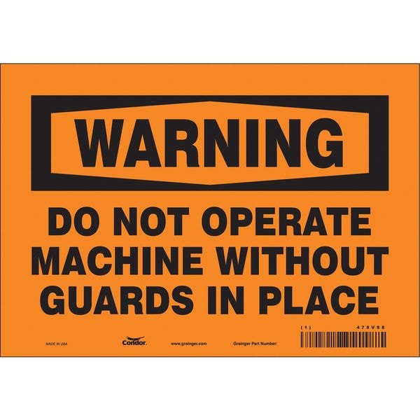 Safety Sign, Vertical Rectangle, Number of Printed Sides 1, English, Sign Format Traditional OSHA, Sign Legend Do Not Operate Machine Without Guards In Place, Sign Legend Background Color Orange, Sign Legend Style Text