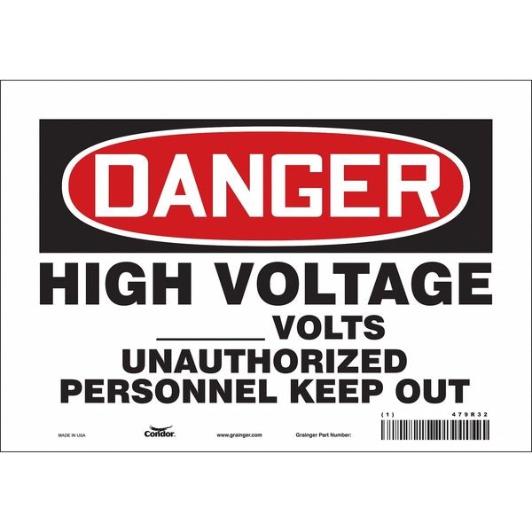 Safety Sign, Vertical Rectangle, Number of Printed Sides 1, English, Sign Format Traditional OSHA, Sign Legend High Voltage _______ Volts Unauthorized Personnel Keep Out, Sign Legend Background Color White, Sign Legend Style Text