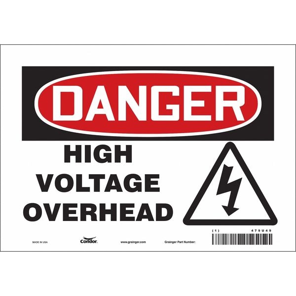 Safety Sign, Vertical Rectangle, Number of Printed Sides 1, English, Sign Format Traditional OSHA, Sign Legend High Voltage Overhead, Sign Legend Background Color White, Sign Legend Style Symbol and Text