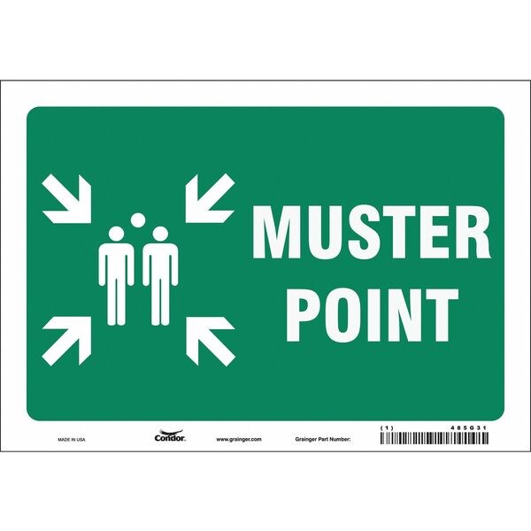 Safety Sign, Vertical Rectangle, Number of Printed Sides 1, English, Sign Legend Muster Point, Sign Legend Background Color Green, Sign Legend Style Symbol and Text
