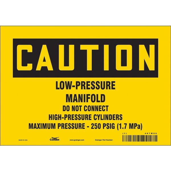 Safety Sign, Vertical Rectangle, Number of Printed Sides 1, English, Sign Format Traditional OSHA, Sign Legend Low-Pressure Manifold Do Not Connect High-Pressure Cylinders Maximum Pressure=250Psig (1.7Mpa), Sign Legend Background Color Yellow, Sign Legend Style Text