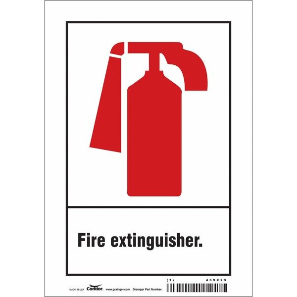 Safety Sign, Horizontal Rectangle, Number of Printed Sides 1, English, Sign Legend Fire Extinguisher., Sign Legend Background Color White, Sign Legend Style Symbol and Text