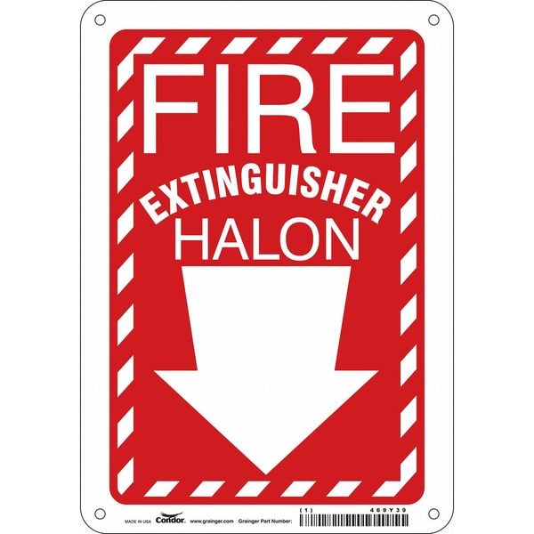 Safety Sign, Horizontal Rectangle, Number of Printed Sides 1, English, Sign Legend Fire Extinguisher Halon, Sign Legend Background Color Red, White, Sign Legend Style Symbol and Text