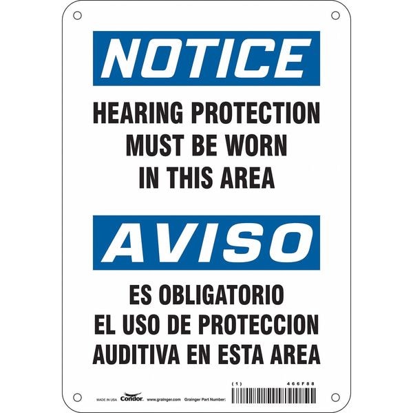 Safety Sign, Horizontal Rectangle, Number of Printed Sides 1, English, Spanish, Sign Format Traditional OSHA, Sign Legend Hearing Protection Must Be Worn In This Area/Es Obligatorio El Uso De Proteccion Auditiva En Esta Area, Sign Legend Background Color White, Sign Legend Style Text
