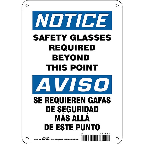 Safety Sign, Horizontal Rectangle, Number of Printed Sides 1, English, Spanish, Sign Format Traditional OSHA, Sign Legend Safety Glasses Required Beyond This Point/Anteojos De Seguridad Requeidos Mas Alla De Este Punto, Sign Legend Background Color White, Sign Legend Style Text