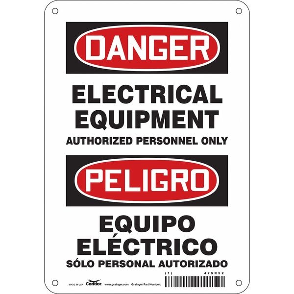 Safety Sign, Horizontal Rectangle, Number of Printed Sides 1, English, Spanish, Sign Format Traditional OSHA, Sign Legend Electrical Equipment Authorized Personnel Only/Equipo Electrico Solo Personal Autorizado, Sign Legend Background Color White, Sign Legend Style Text
