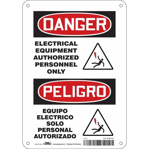Safety Sign, Horizontal Rectangle, Number of Printed Sides 1, English, Spanish, Sign Format Traditional OSHA, Sign Legend Electrical Equipment Authorized Personnel Only/Equipo Electrico Solo Personal Autorizado, Sign Legend Background Color White, Sign Legend Style Symbol and Text