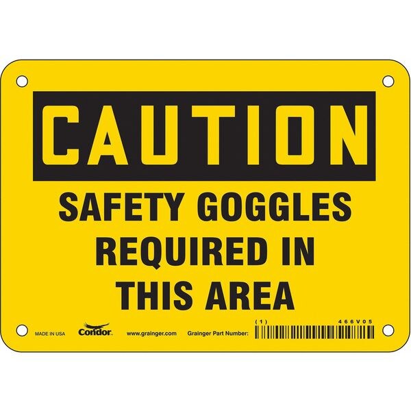 Safety Sign, Horizontal Rectangle, Number of Printed Sides 1, English, Sign Format Traditional OSHA, Sign Legend Safety Goggles Required In This Area, Sign Legend Background Color Yellow, Sign Legend Style Text