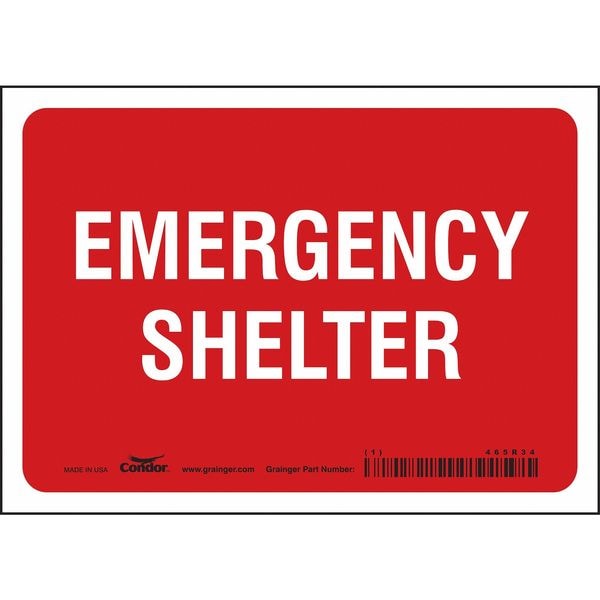 Safety Sign, Horizontal Rectangle, Number of Printed Sides 1, English, Sign Format Other Format, Sign Legend Emergency Shelter, Sign Legend Background Color Red, Sign Legend Style Text