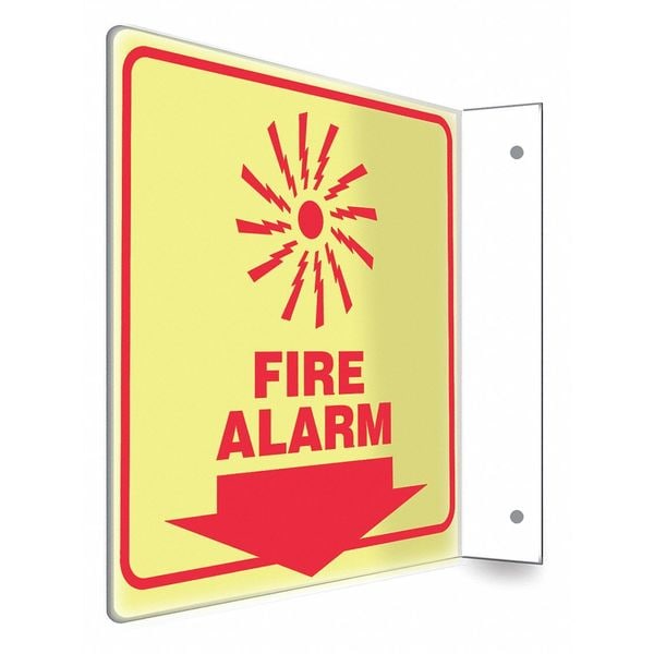 Safety Sign, L-Shape Projection, Number of Printed Sides 2, English, Sign Format Other Format, Sign Legend Fire Alarm, Sign Legend Background Color White, Sign Legend Style Symbol and Text
