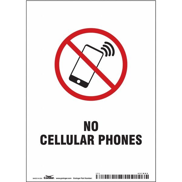 Safety Sign Cell Phone, Vertical Rectangle, Number of Printed Sides 1, English, Sign Legend No Cellular Phones, Sign Legend Background Color White, Sign Legend Style Symbol and Text