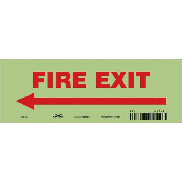 Safety Sign Emergency Exit, Glow Vinyl, 10 in W, 3 1/2 in H, FIRE EXIT W/SYMBOL, White