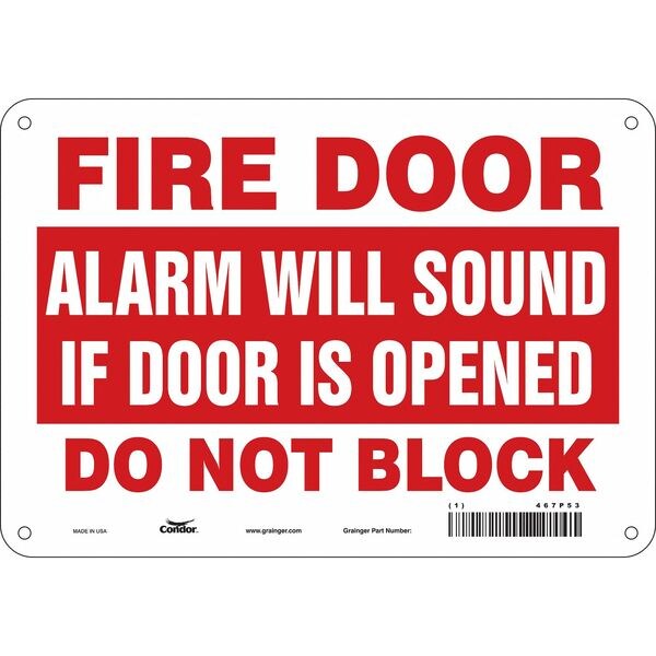 Safety Sign Emergency Exit, Vertical Rectangle, Number of Printed Sides 1, English, Sign Format Other Format, Sign Legend Fire Door Alarm Will Sound If Door Is Opened Do Not Block, Sign Legend Background Color Red, White, Sign Legend Style Text