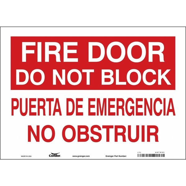 Safety Sign Emergency Exit, Horizontal Rectangle, Number of Printed Sides 1, English, Spanish, Sign Legend Fire Door Do Not Block / Puerta De Emergencia No Obstruir, Sign Legend Background Color Red, White, Sign Legend Style Text