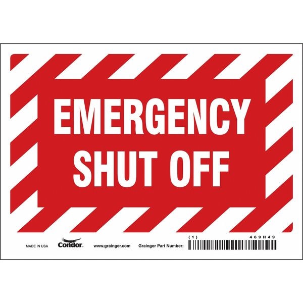 SAFETY SIGN FIRE AND EMERGENCY, Horizontal Rectangle, Number of Printed Sides 1, English, Sign Legend Emergency Shut Off, Sign Legend Background Color Red, White, Sign Legend Style Text