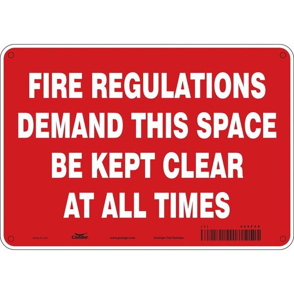 SAFETY SIGN FIRE AND EMERGENCY, Vertical Rectangle, Number of Printed Sides 1, English, Sign Legend Fire Regulations Demand This Space Be Kept Clear At All Times, Sign Legend Background Color Red, Sign Legend Style Text