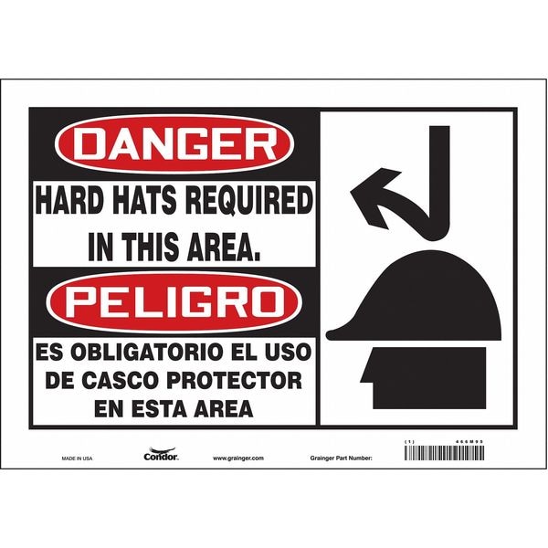 Safety Sign, Horizontal Rectangle, Number of Printed Sides 1, English, Spanish, Sign Format Traditional OSHA, Sign Legend Hard Hats Required In This Area/Es Obligatorio El Uso De Casco Protector En Esta Area, Sign Legend Background Color White, Sign Legend Style Symbol and Text