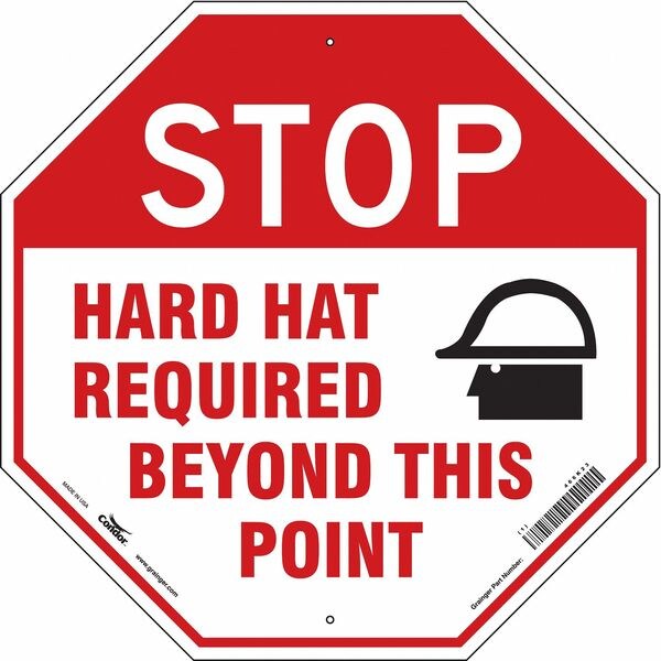 Safety Sign, Octagon, Number of Printed Sides 1, English, Sign Format Other Format, Sign Legend Stop Hard Hat Required Beyond This Point, Sign Legend Background Color Red, White, Sign Legend Style Symbol and Text