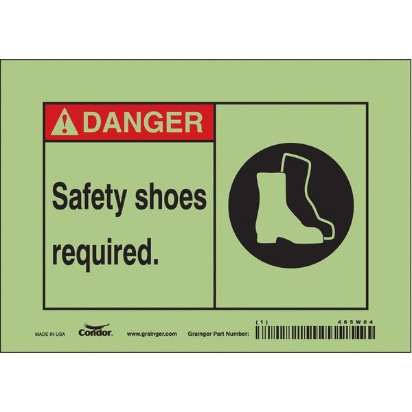 Safety Sign, Horizontal Rectangle, Number of Printed Sides 1, English, Sign Format ANSI/OSHA Format, Sign Legend Safety Shoes Required., Sign Legend Background Color White, Sign Legend Style Symbol and Text