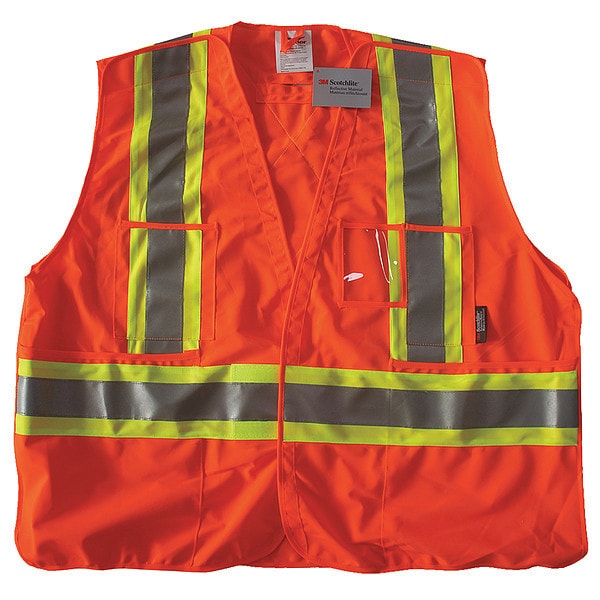 High-Visibility Vest, ANSI Class Not Rated, Vest Size 2XL, 3XL, Traffic Safety Vest Color Orange/Red, Fits Chest Size 54 in to 60 in, Gender Men's, Stripe Color Silver, Vest Material Polyester, Vest Closure Type Hook-and-Loop, ATPV Rating Not Rated, Hazard Risk Category (HRC) 0, Vest Stripe Color Family Lime/Silver, Back Stripe Pattern X, Vest Length 30 in, Number of Pockets (Inside) 0, Number of Pockets (Outside) 4, Number of Pockets with Closure 4, Features ID Window, Reflective