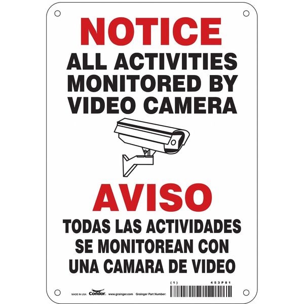Security Sign, Horizontal Rectangle, Number of Printed Sides 1, English, Sign Legend All Activities Monitored By Video Camera/Aviso Todas Las Actividades Se Monitorean Con Una Camara De Video, Sign Legend Background Color White, Sign Legend Style Symbol and Text
