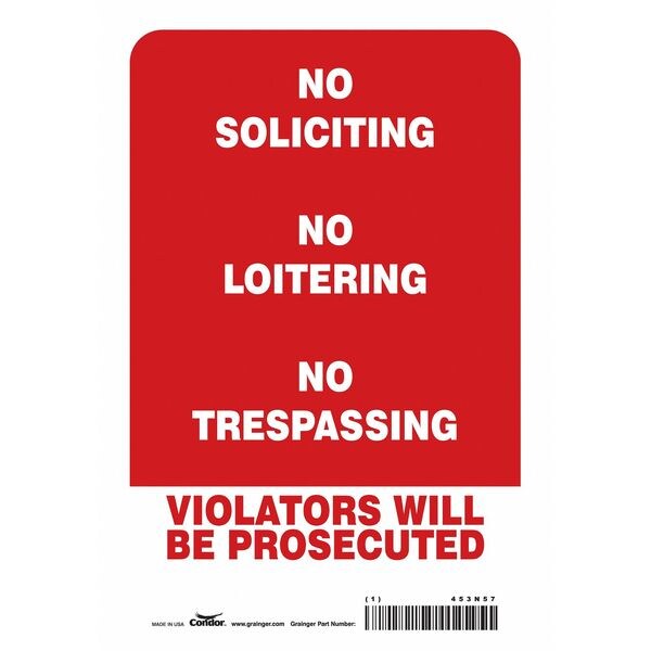 Security Sign, Horizontal Rectangle, Number of Printed Sides 1, English, Sign Format Other Format, Sign Legend No Soliciting No Loitering No Tresspassing Violators Will Be Prosecuted, Sign Legend Background Color Red, White, Sign Legend Style Text