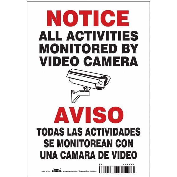 Security Sign, Horizontal Rectangle, Number of Printed Sides 1, English, Sign Legend All Activities Monitored By Video Camera/Aviso Todas Las Actividades Se Monitorean Con Una Camara De Video, Sign Legend Background Color White, Sign Legend Style Symbol and Text