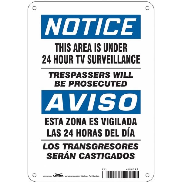 Security Sign, Horizontal Rectangle, Number of Printed Sides 1, English, Spanish, Sign Legend This Area Is Under 24 Hour TV Surveillance Trespassers Will Be Prosecuted/ Esta Zona Esta Vigilada Las 24 Horas Del Dia. Los Transgresores Seran Castigados, Sign Legend Background Color White, Sign Legend Style Text