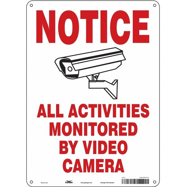 Security Sign, Vertical Rectangle, Number of Printed Sides 1, English, Sign Legend Notice All Activities Monitored By Video Camera, Sign Legend Background Color White, Sign Legend Style Symbol and Text