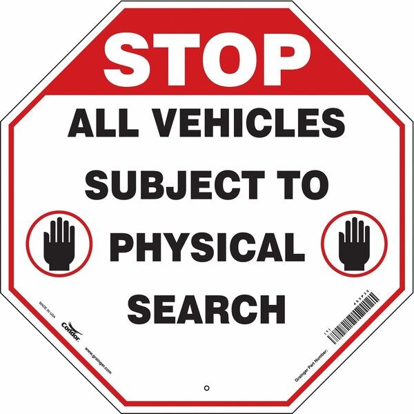 Security Sign, Octagon, Number of Printed Sides 1, English, Sign Format Other Format, Sign Legend Stop All Vehicles Subject To Physical Search Indoor/Ourdoor Portable Safety Sign, Sign Legend Background Color Red, White, Sign Legend Style Symbol and Text