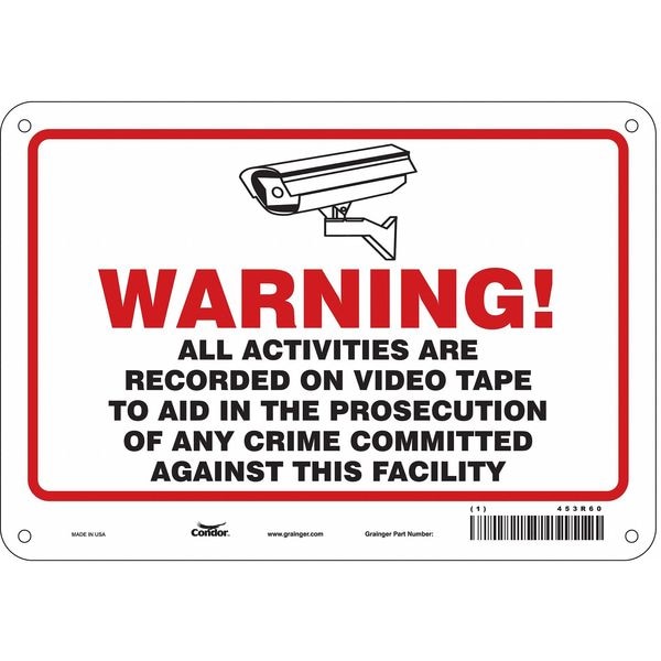 Security Sign, Vertical Rectangle, Number of Printed Sides 1, English, Sign Legend Warning All Activities Are Recorded On Video Tape To Aid In The Prosecution Of Any Crime Committed Against This Facility, Sign Legend Background Color White, Sign Legend Style Symbol and Text