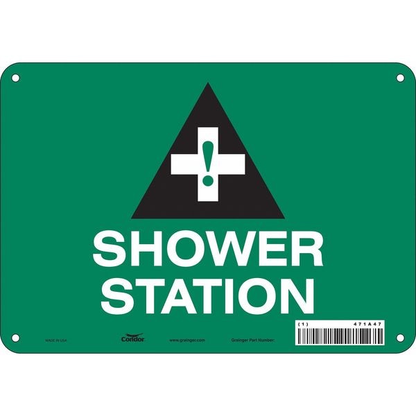 Safety Sign, Vertical Rectangle, Number of Printed Sides 1, English, Sign Legend Shower Station, Sign Legend Background Color Green, Sign Legend Style Symbol and Text