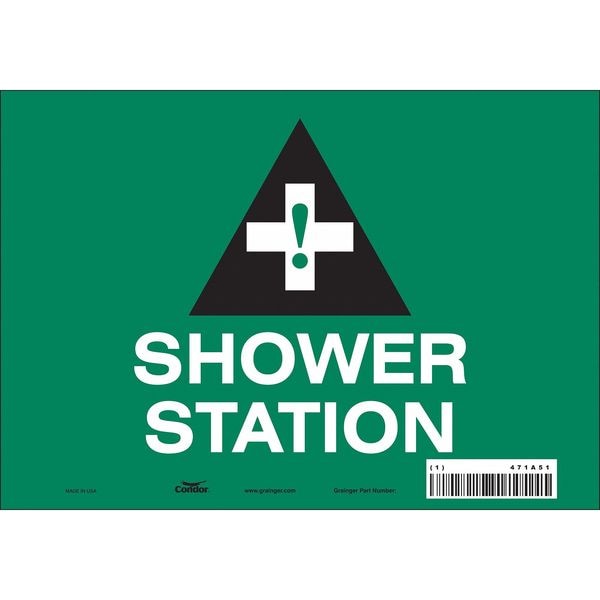 Safety Sign, Vertical Rectangle, Number of Printed Sides 1, English, Sign Legend Shower Station, Sign Legend Background Color Green, Sign Legend Style Symbol and Text