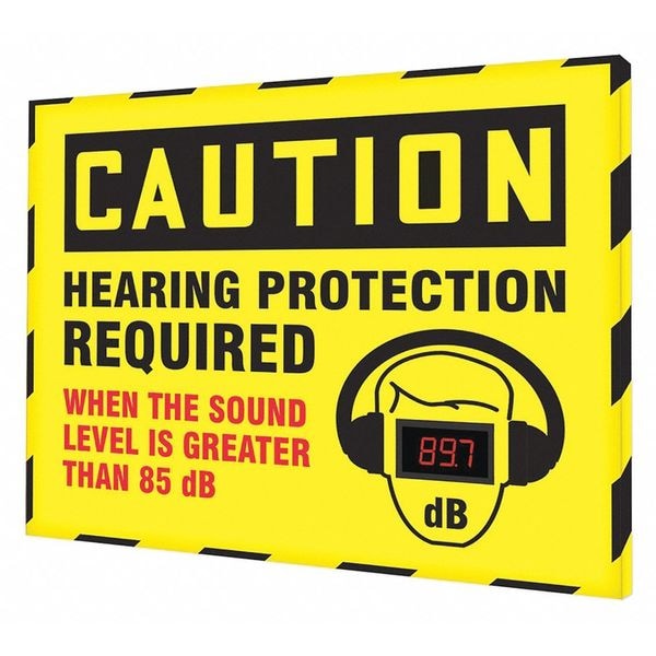 Sound Level Decibel Meter Sign, Horizontal Rectangle, Number of Printed Sides 1, English, Sign Format Traditional OSHA, Sign Legend Hearing Protection Required When The Sound Level Is Greater Than 85 dB, __dB, Sign Legend Background Color Black, Yellow, Sign Legend Style Symbol and Text