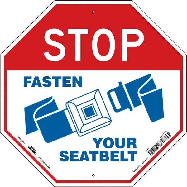 Safety Sign, Octagon, Number of Printed Sides 1, English, Sign Format Other Format, Sign Legend Stop Fasten Your Seatbelt, Sign Legend Background Color Red, White, Sign Legend Style Symbol and Text