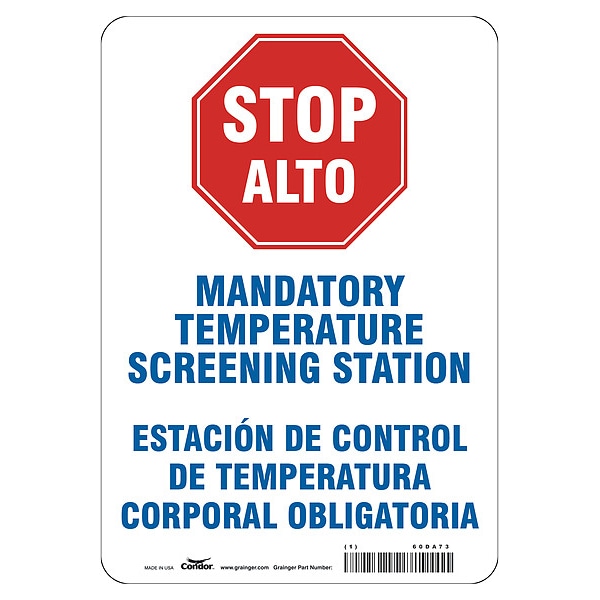 Bilingual Temperature Screening Sign, Sign Subject Matter Coronavirus Prevention, Height 10 in, Width 7 in, Sign Material Polyester, Sign Mounting Style Adhesive Surface, Header No Header, Legend Stop Alto Mandatory Temperature Screening Station Estación De Control De Temperatura Corporal Obligatoria, Printed Language English, Spanish, Sign Shape Rectangle