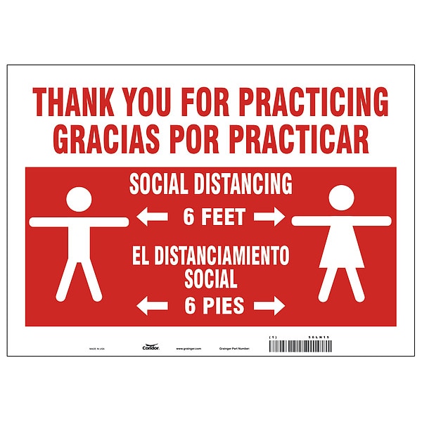 Covid 19 Sign 10X14, Eng/Span Practice S, Sign Subject Matter Coronavirus Prevention, Height 10 in, Width 14 in, Sign Material Aluminum, Sign Mounting Style With Mounting Holes, Header Thank You For Practicing/Gracias Por Practicar, Legend Social Distancing 6 Feet/El Distanciamiento Social 6 Pies, Printed Language English, Spanish